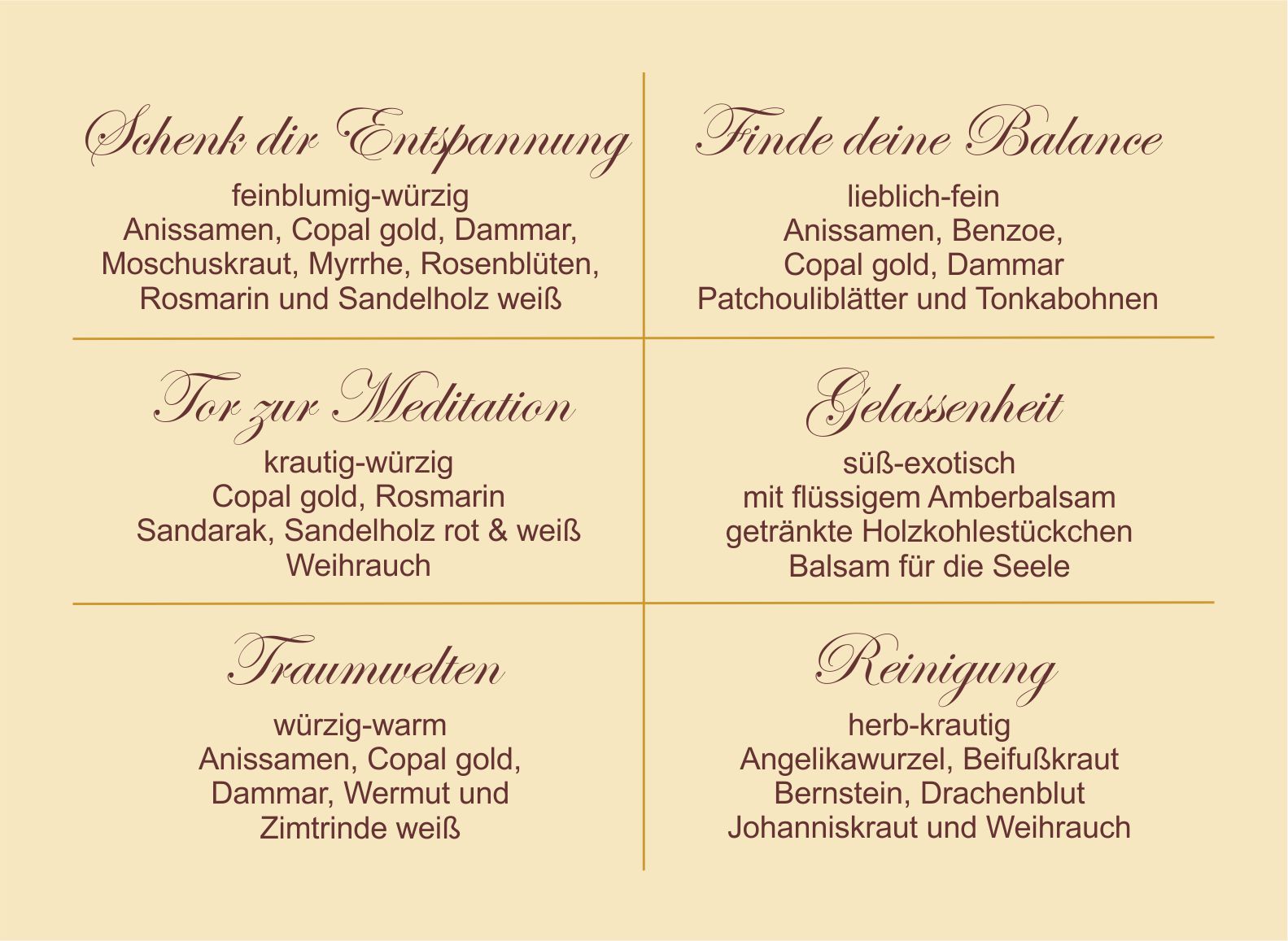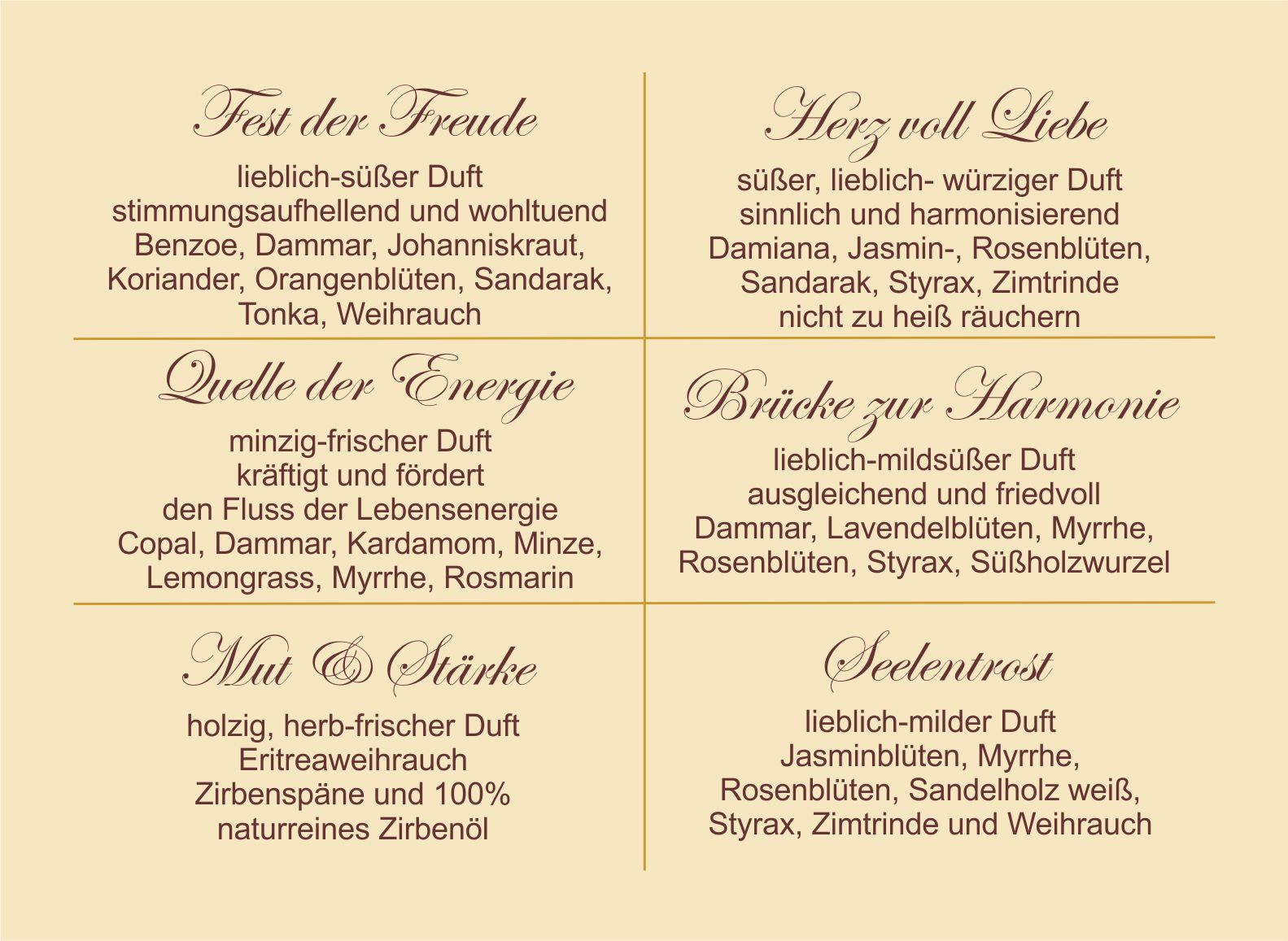 Mischungen: Fest der Freude, Herz voll Liebe, Quelle der Energie, Brücke zur Harmonie, Mut & Stärke, Seelentrost, Schenk dir Entspannung, Finde deine Balance, Tor zur Meditation, Gelassenheit, Traumwelten und Reinigung