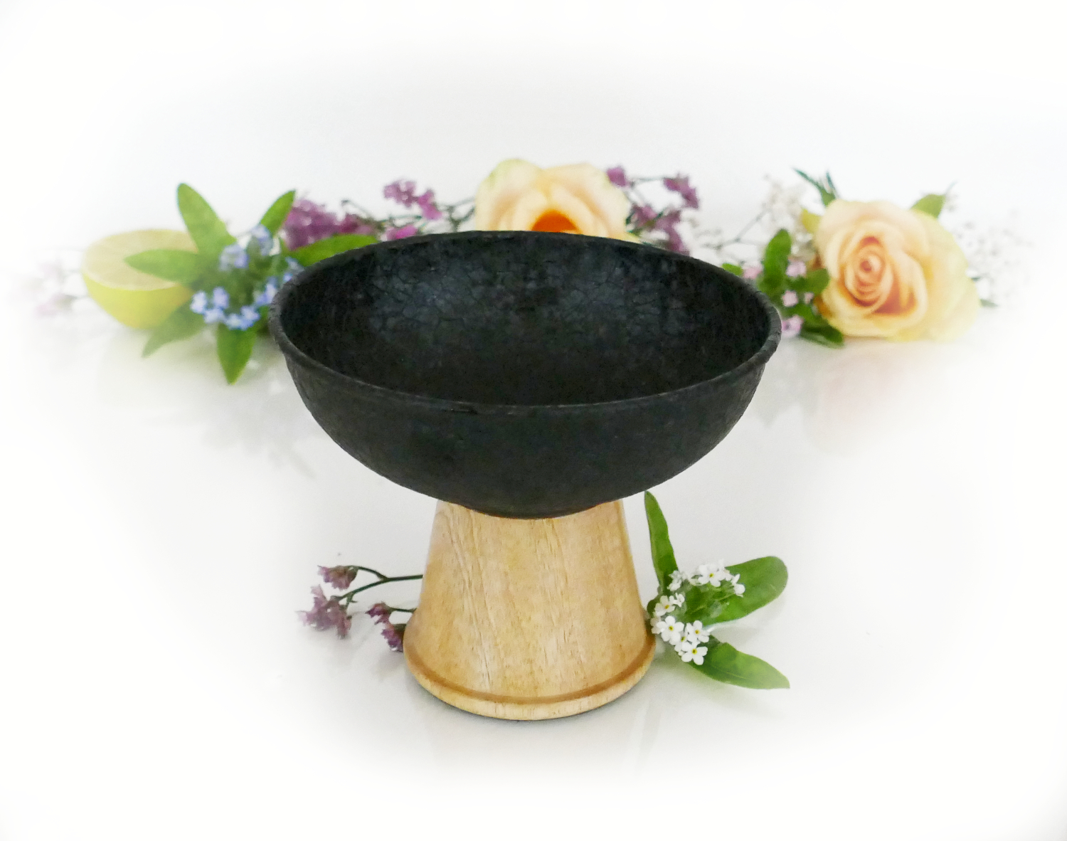 Räucherkelch in schlichter Eleganz. Pulverbeschichtetes Eisen mit Mangoholzfuß.