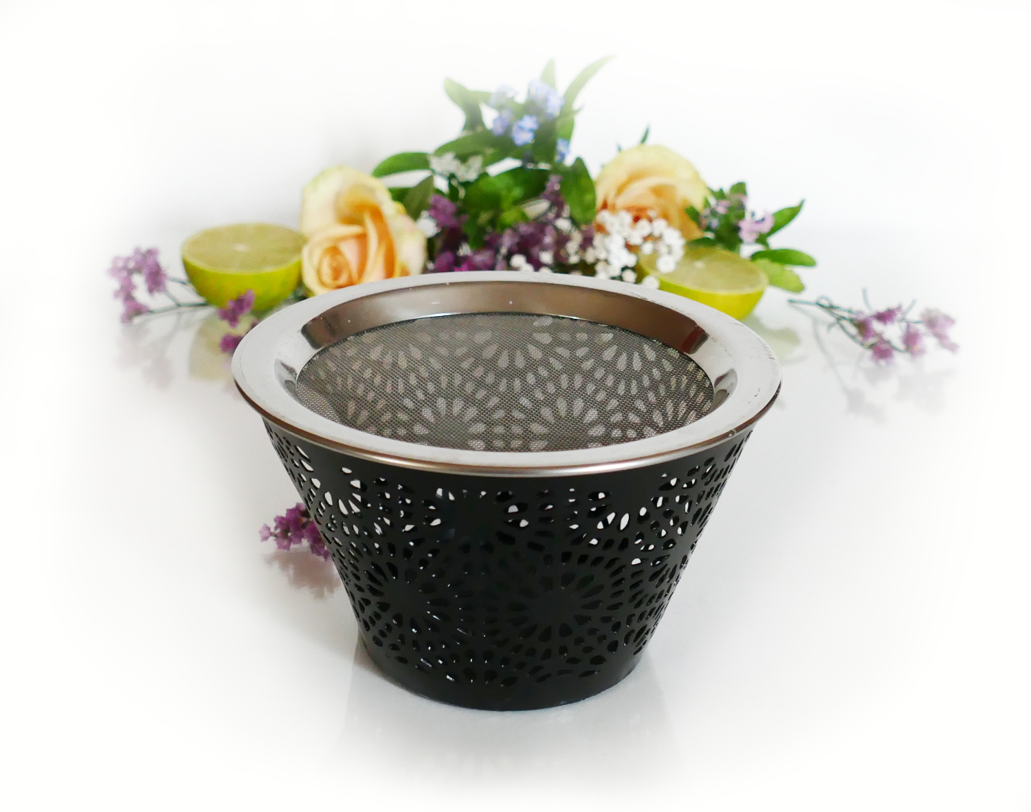edles Siebgefäß mit orientalischen Ornamenten, aus pulverbeschichtetem Eisen mit großem Edelstahlsieb 12,5 cm
